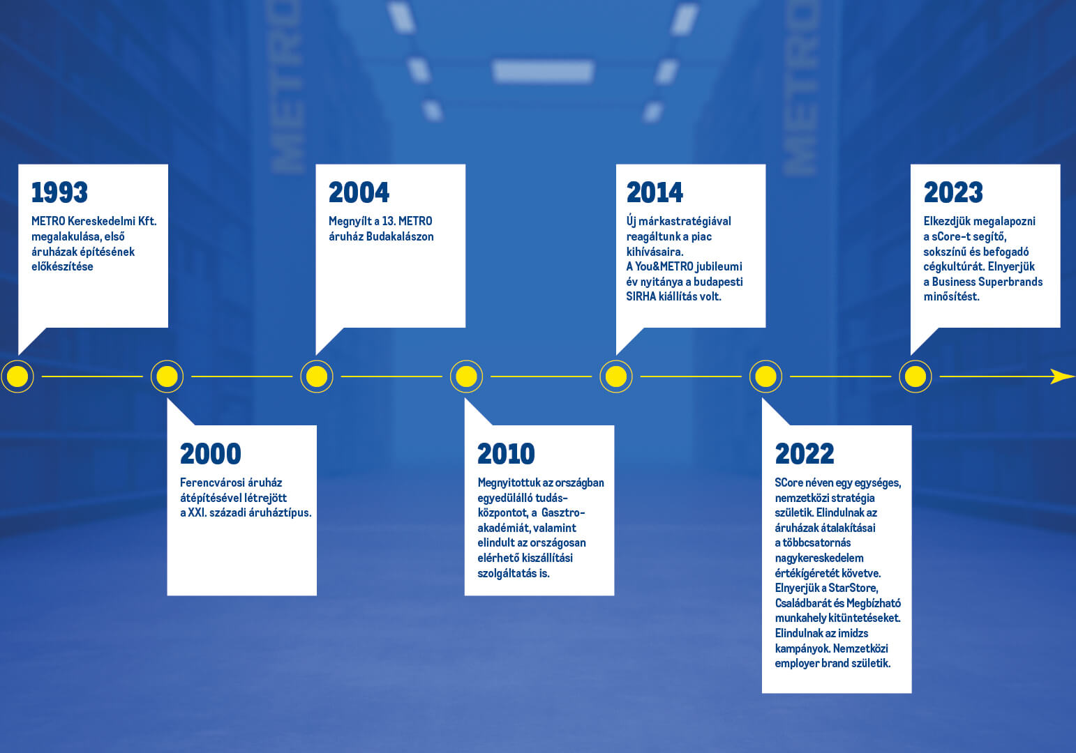 A METRO 1993-ban elsőként lépett be a nemzetközi kereskedelmi vállalatok közül a magyar piacra. Üzleti koncepciónk, hogy a több, mint 2000 fős magyar csapattal maximálisan támogassuk a professzionális vevőinket abban, hogy vállalkozásukat sikerre vigyék, célunk az, hogy az első számú partnerükké váljunk. Mottónk: “Csúcsra törünk a nagykereskedelemben.”